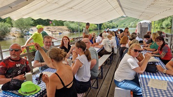 Besuch der Abtei Münsterschwarznach, Weinkellerbesichtigung in Sommerach, Floßfahrt auf dem Main.